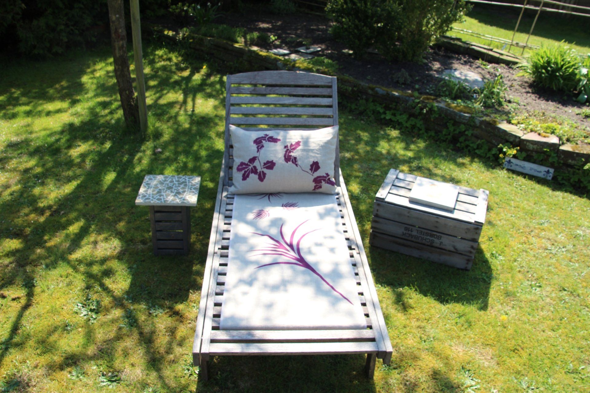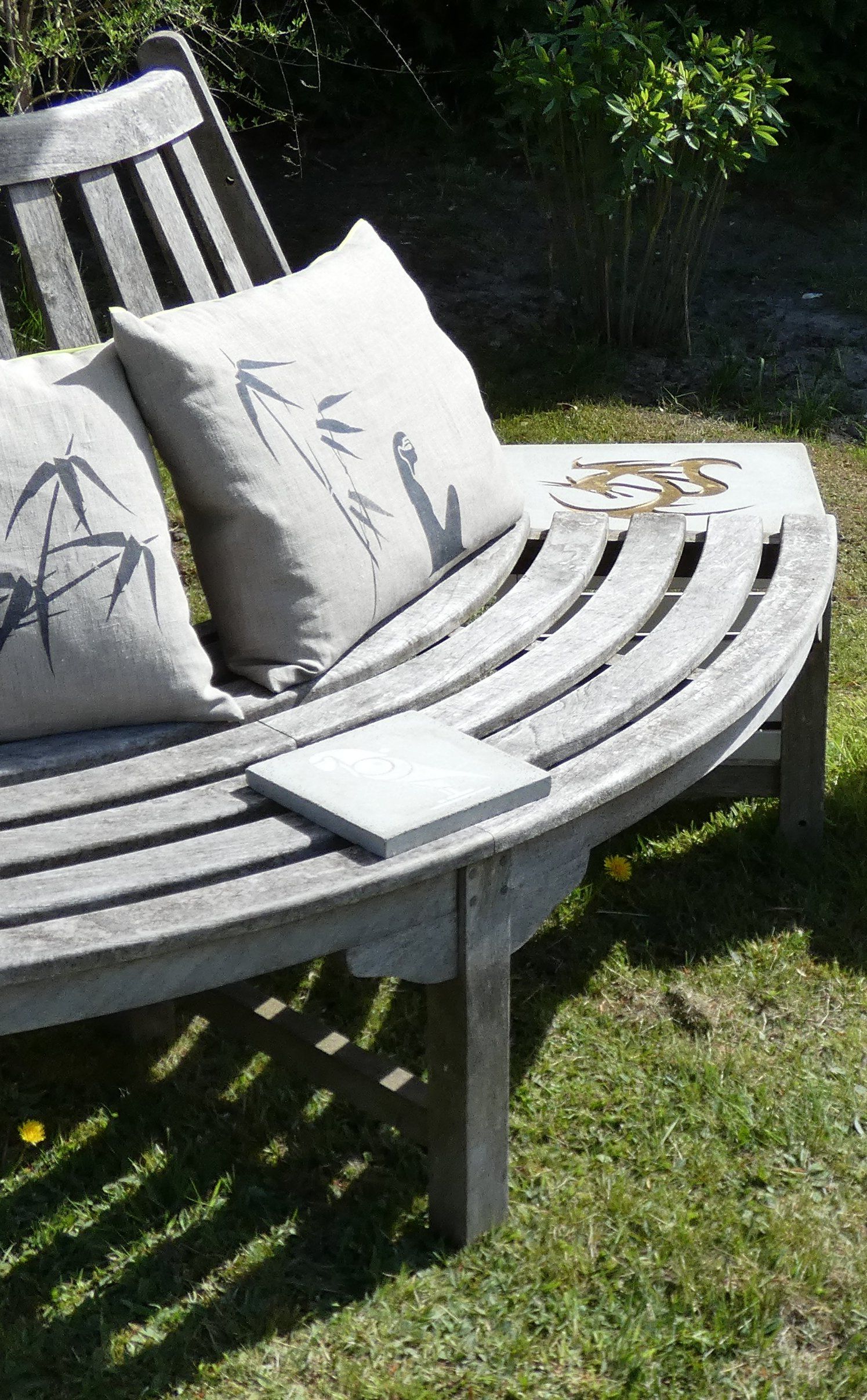 Kissen, Tischdecken, Läufer und andere textile Objekte werden filigran von Hand bedruckt. Die Schablone folgt keinem Rapport: die Motive werden stets neu platziert und angeordnet. Durch die Vielzahl mittels Pinsel gesetzter Druckvorgänge entstehen einzigartige, lebhafte Farbflächen und bildähnliche Unikate, selbst bei gleicher Vorlage.
